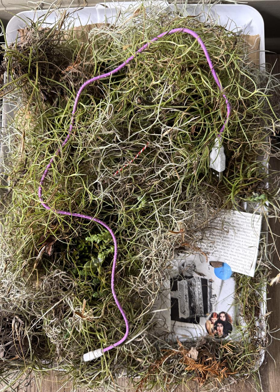A living assemblage of moss, tillandsia, cardboard, string, and salvaged paper fragments, A extends ReLeaf’s ethos of Adaptive Reuse—transforming discarded materials into new forms of value, merging creativity with sustainability. The piece is both fragile and resilient, shifting slowly as its organic components grow, dry, and settle into one another.